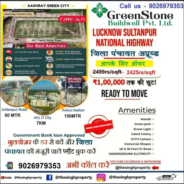 District Panchayat Approval PROJECT in Lucknow (Avoid the fear of bulldozer and with District Panchayat approval project) Buy a plot -(Lucknow City) ON HIGHWAY) GOVT. BANK LOAN AVAILABLE COMPANY NAME - Greenstone Buildwell Pvt.Ltd. Project Name :- Ashray Green CityRate:- 2499 sqft Location:- Gosaiganj Market Sultanpur road, Lucknow Plot size :- 600,800,1100,1125,1250,1560,1740 sqft Booking amount:- 2 lakh only Bank loan- All Govt BankDistrict board approved No - 562/2024-2025 Date -19/09/2024Features -30-40 feet roadgated colony parklight Sever drainage 24×7 security cctv camera Etc.Near by -Sultanpur Road on HIGHWAYGosaiganj MarketPurwanchal Expresswayhcl it cityamul dairyouter ring roadsahid path army cantonmentawas vikas yojanaISBT BUS STANDCheap plots in Lucknow located near the highway, definitely visit once!The aim of our real estate company is to provide you with the property of your choice. Everyone needs a home – Everyone deserves to have their own home – we are making that dream come true for you. (Your trust is our duty) Call - 9026979353
