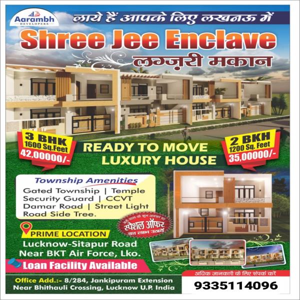 3-BHK luxury house 1600 Sq. Feet 42 Lakh 2-BHK luxury house 1200 Sq. Feet 35 Lakh Gated Township (Ready To Move House) prime location Sitapur Road, Near BKT Air Force (Loan facility available) Contact for booking and information 9335114096