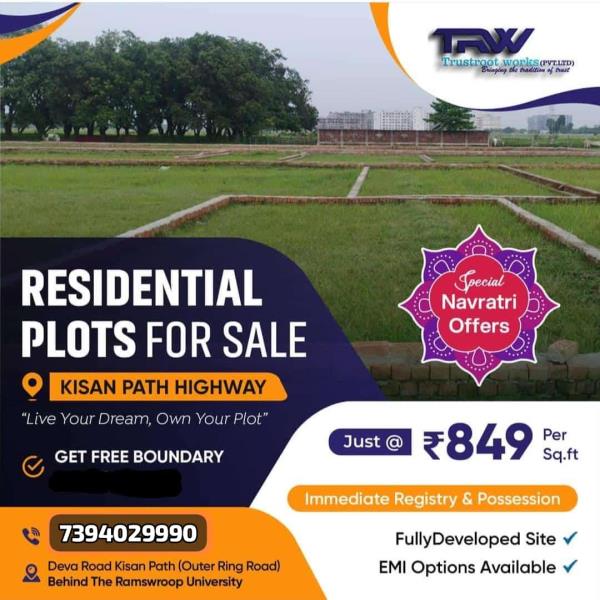 This Navratri, get absolutely free boundary with attractive discount on purchase of 1000 Sqft plot....A great residential plot in low budget with immediate registry possession in Deva Road Lucknow near Kisan Path & Ramswaroop University Tindola at just Rs 849/Sq.Ft. Registry possession at only 80% payment.For site visit or booking contact-*+91-7394029990Head Office- 3/176, Vikrant Khand, Gomti Nagar, Lucknow